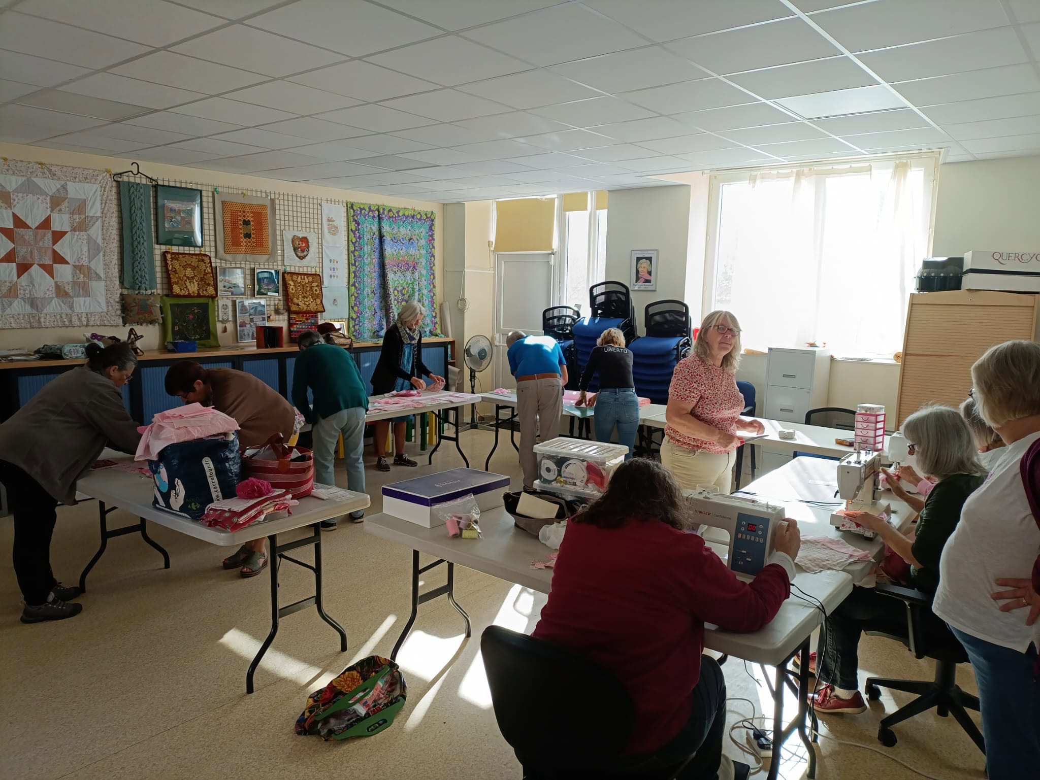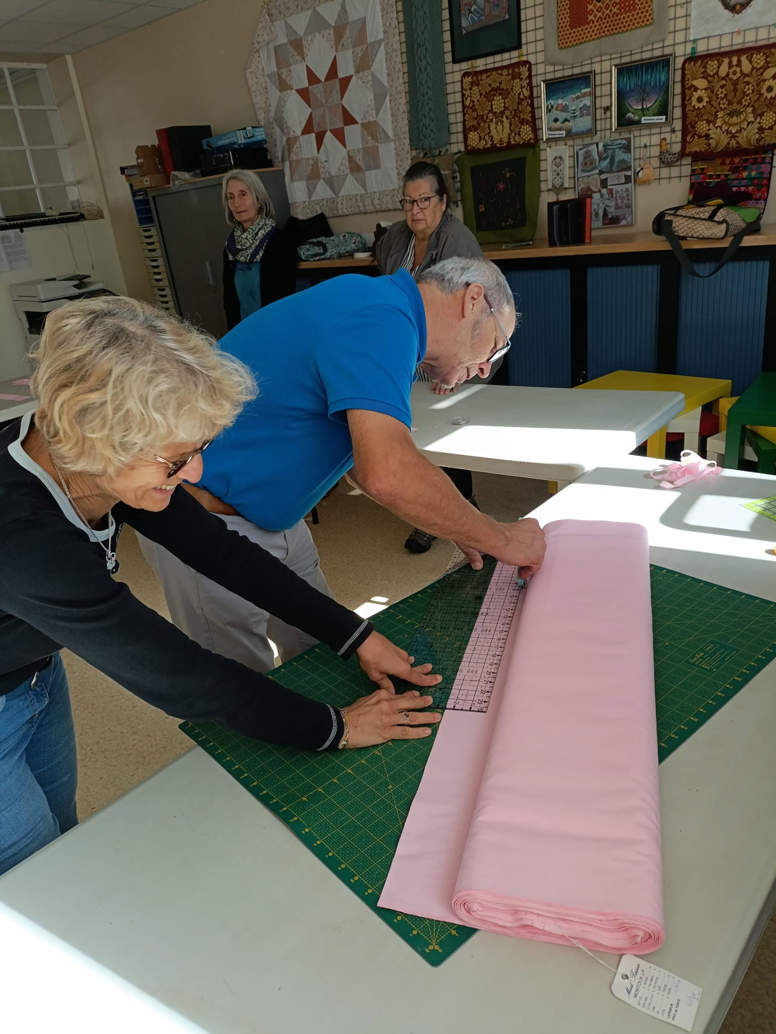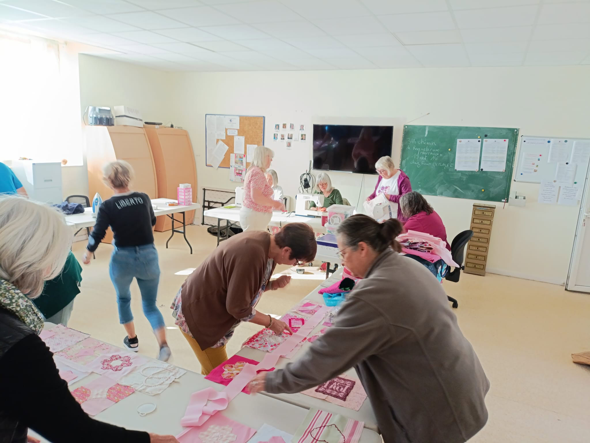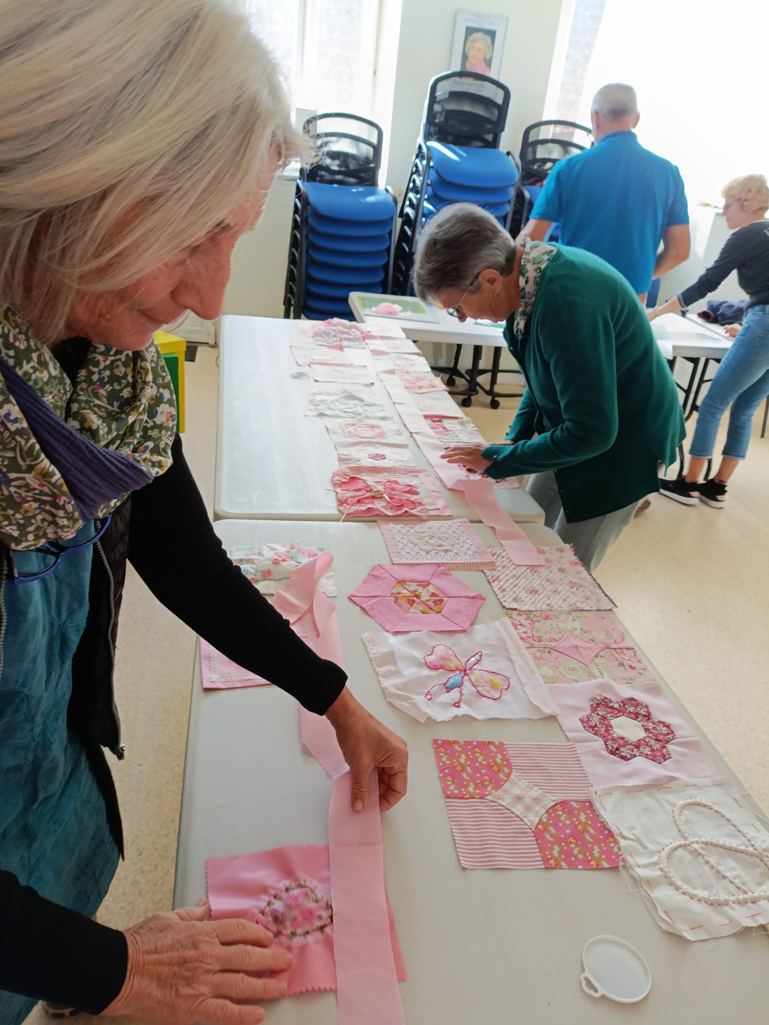 la créativité s’est mise au service de la solidarité. À l’occasion d’Octobre Rose, quelques membres du club se sont réunis autour d’un beau projet collectif : la création d’un patchwork aux mille nuances de rose, symbole de soutien à la lutte contre le cancer. De nombreuses mains, essentiellement féminines mais pas que…, ont participé à cette aventure textile. Chacun a apporté sa touche personnelle, un carré de tissu à son image, plein de douceur et d’espérance. Assemblés avec soin, ces carrés forment aujourd’hui une véritable œuvre commune, vibrante de couleurs et de générosité.